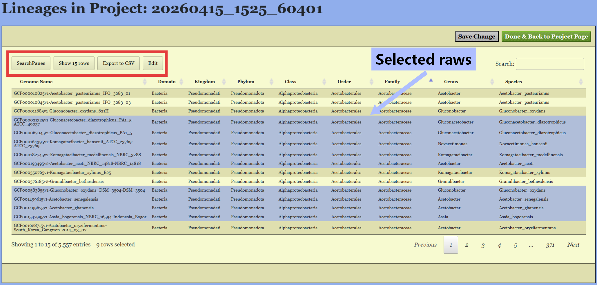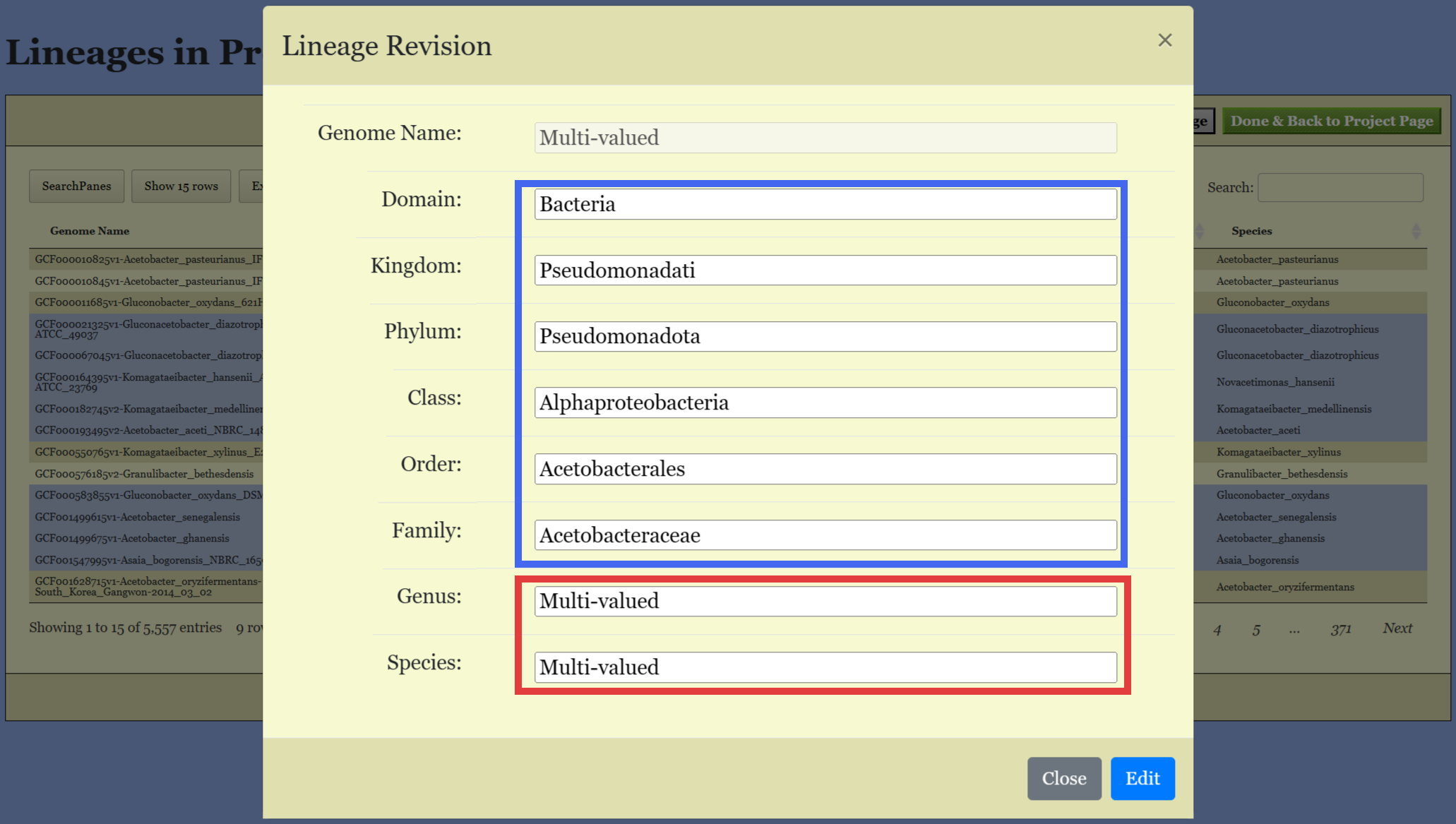 Editbutton to revise the lineage information of selected genomes. - Change the taxon name in the text box.