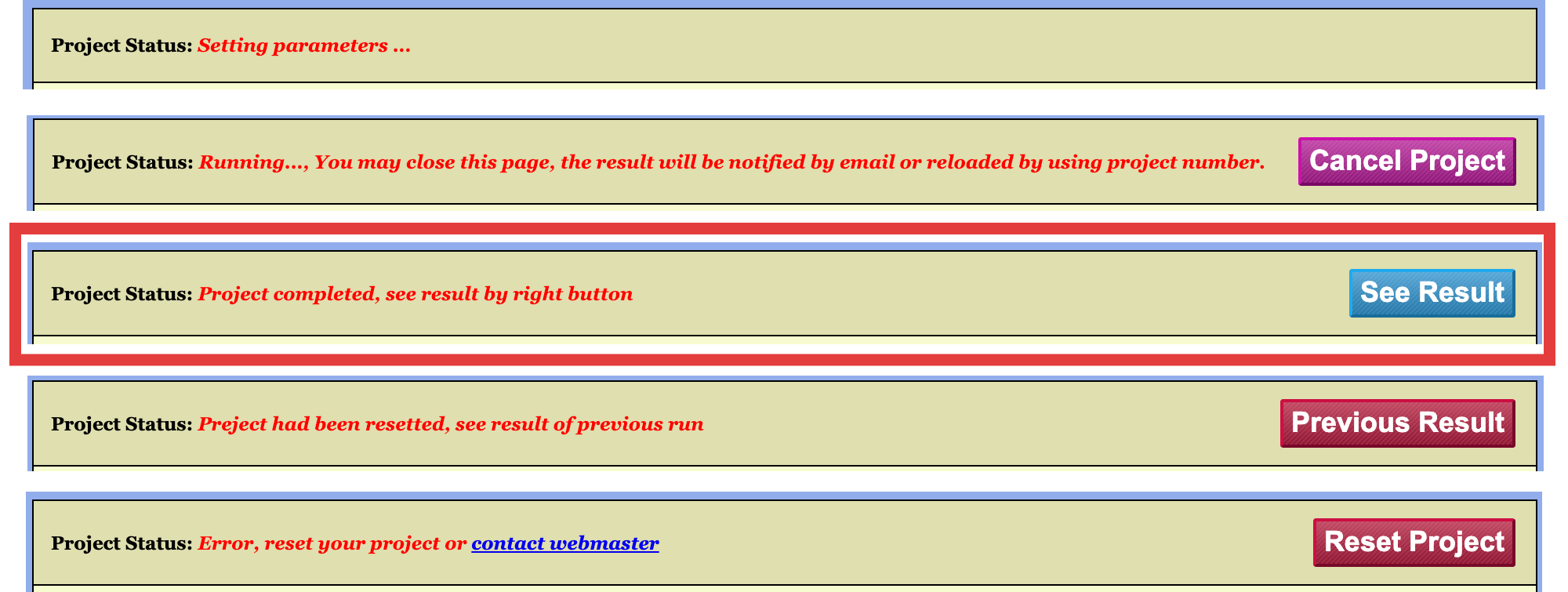 See Resultbutton to enter TaxonView. - Resetting: The project is resetting.